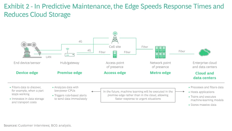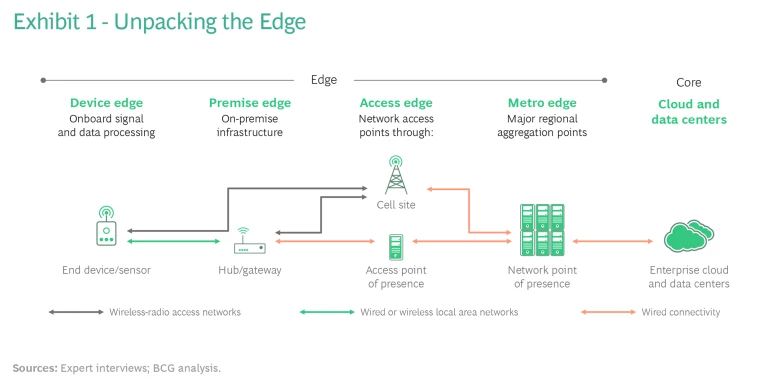 According to many definitions, the edge is limited to, or is close to, IoT devices themselves. But that narrow focus misses the connectivity and data flows that bring edge computing to life, as well as the hardware and infrastructure that link the edge to the cloud. To provide an end-to-end view, we divide the edge into four stages, as shown in Exhibit 1, according to where computation and storage occur:
