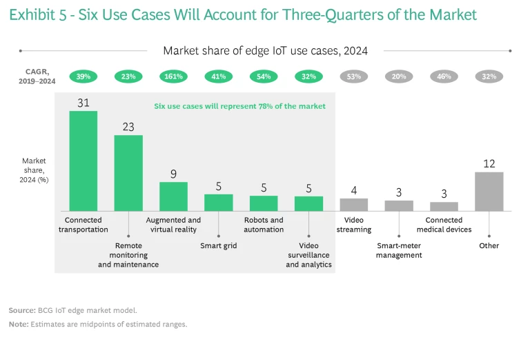 By mixing and matching these five benefits in various combinations, companies can add capabilities that are more efficiently provided on the edge. We anticipate that six use cases will likely account for more than three-quarters of the edge computing market in 2024. (See Exhibit 5.) The first two of them will be far larger than the rest.
