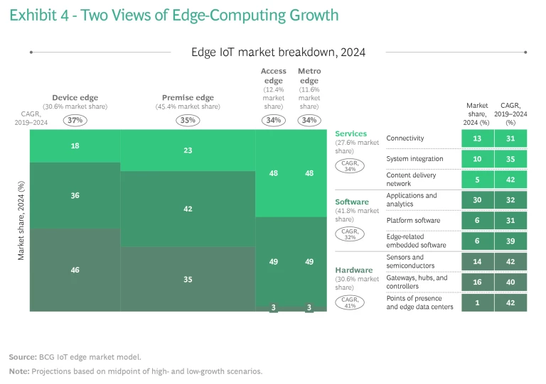 If the edge is viewed as a stack of services, software, and hardware, each of these layers is likely to grow by at least 30% a year. The applications and analytics sublayer will continue to be the largest slice of the market through 2024, while the hardware layer is likely to be the fastest growing. (See Exhibit 4.)