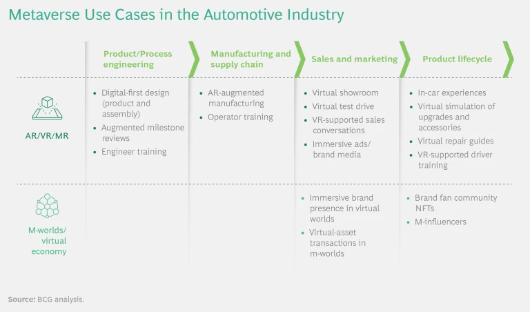 In the automotive industry, AR and VR are being used across the value chain from product and process engineering to sales and after-sales support and service. (See the exhibit.) OEMs and their major suppliers are adopting the technology in engineering and operator training to create virtual showrooms and test drive experiences, and to provide virtual repair guides and simulations of upgrades.