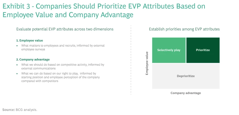 Most health care companies do not have the resources to invest fully in every attribute employees desire. They should identify those that are most important to workers and that are competitive sources of strength for the company. Organizations can then selectively invest in attributes that employees care about but are relative gaps for the company today. Finally, they should not prioritize investment in or communicate those attributes that do not matter to employees. (See Exhibit 3.)