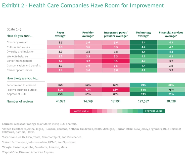 In addition, employees who work for health care companies have specific concerns about who they work for, according to a BCG analysis of employee ratings on Glassdoor, the online employer review site. Employees in the health care industry were less satisfied than their peers in technology and financial services on a range of attributes such as culture and values, career opportunities, and work-life balance—attitudes that an EVP can address. (See Exhibit 2.)