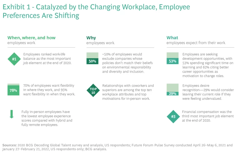- What employees expect from their work. Employees are seeking development opportunities, with 53% already spending significant time on learning and 62% citing better career opportunities as a motivation to change jobs. Employees also desire recognition—29% would consider leaving a job if they felt undervalued. (See Exhibit 1.)