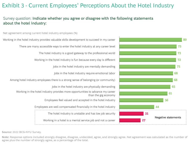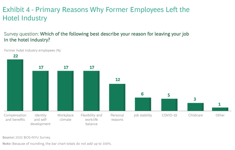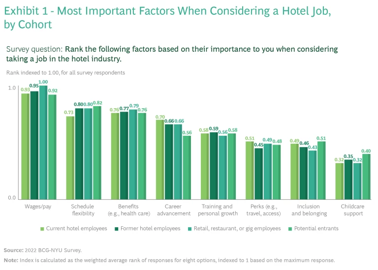 What will it take in a post-pandemic world to change this state of affairs and enable the US hotel industry to attract new employees, retain current ones, and win back former staff? To answer this question, BCG, New York University’s Jonathan M. Tisch Center of Hospitality, and the American Hotel and Lodging Association earlier this year consulted industry leaders to identify the root causes of the current labor challenges and suggest solutions. We then surveyed 1,200 current, former, and prospective hotel industry employees, and employees of adjacent industries such as restaurant and retail, to test the leaders’ ideas on how the industry can better attract and retain workers.