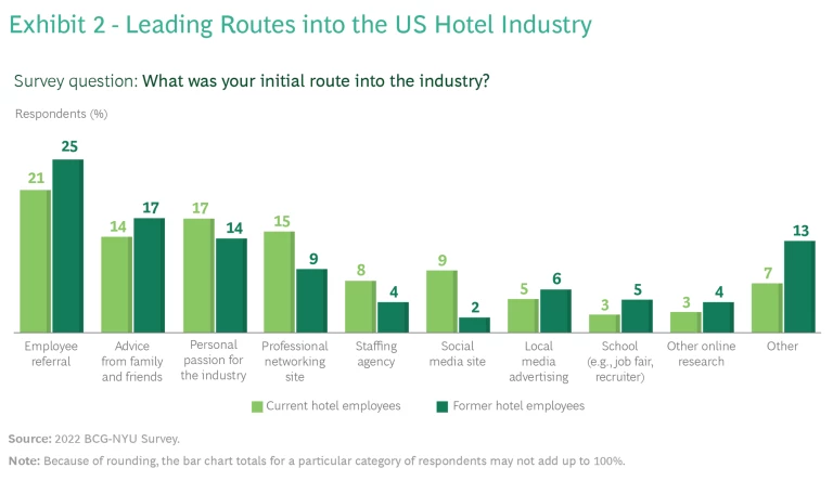 At the same time, far fewer current and former hotel employees in our survey said their pathway into the industry started at school than we had expected. This suggests schools could create greater awareness of the benefits of hotel work among their students. But this would require the hotel industry to engage more proactively with school leaders, career guidance counselors, and career services officers.