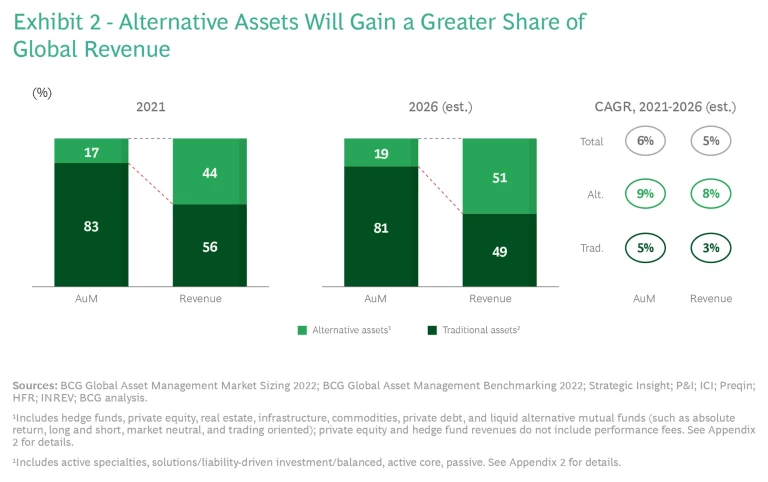 Rising investor interest in alternatives means that asset managers will need to build the capabilities for investing in these assets and distributing them to retail investors. We expect to see alternatives grow to more than half of all global revenues over the next five years. (See Exhibit 2.)