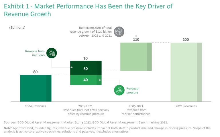 Strong performance in equity markets has been the key driver of growth, representing 90% of the revenue growth between 2005 and 2021. During the same period, revenues from net flows have been almost fully offset by revenue pressures as investors change their asset-class mix toward lower priced products and fee pressure continues. Despite rising costs, operating profit margin rose to a healthy 38% in 2021, up from 36% a year earlier, as average AuM growth outpaced the increase in costs. (See Exhibit 1.)