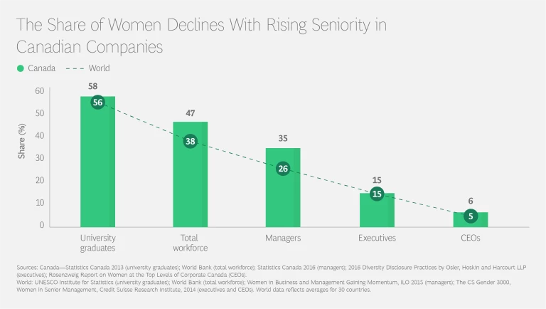 Canada ranks among the global leaders when it comes to female education levels and labor participation rates. However, at more senior levels, the percentage of women falls to the global average. Women in Canada have relatively healthy access to employment opportunities early in their careers, but they are simply not scaling the corporate ladder at the same pace as men.