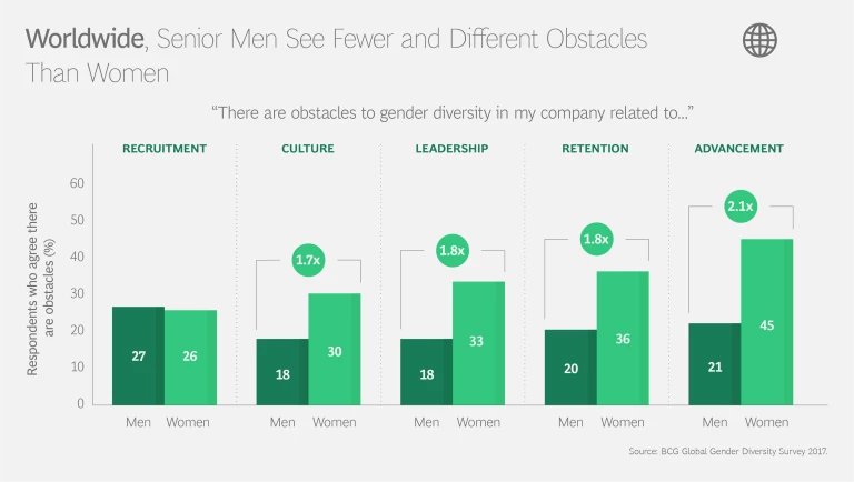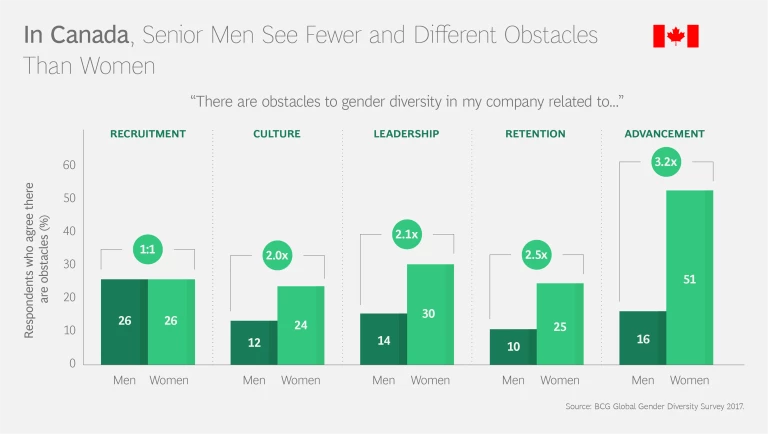 The global study shows that there is a gap worldwide between how male senior leaders view the obstacles to gender diversity and how women view those obstacles. Senior male leaders see recruiting female employees as the major obstacle, while women consistently point to advancement, retention, and leadership as more important. This perception gap is significantly higher in Canada than the global average.