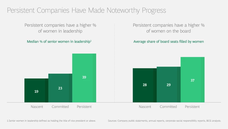 About a quarter of the companies covered in the survey are classified as “persistent.” These companies have been actively implementing a focused diversity agenda for several years. They take an end-to-end approach to program implementation and have made progress: the persistent companies in our sample have, on average, 39% of women in senior leadership positions, compared to 23% for committed companies and 19% for nascent companies.