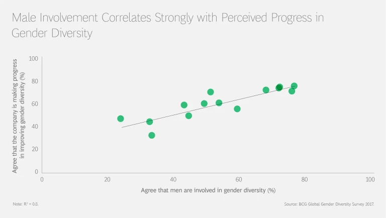 Across the Canadian companies that BCG surveyed, there was an 80% correlation between the involvement of men in the gender diversity programs and the view that progress was being made.