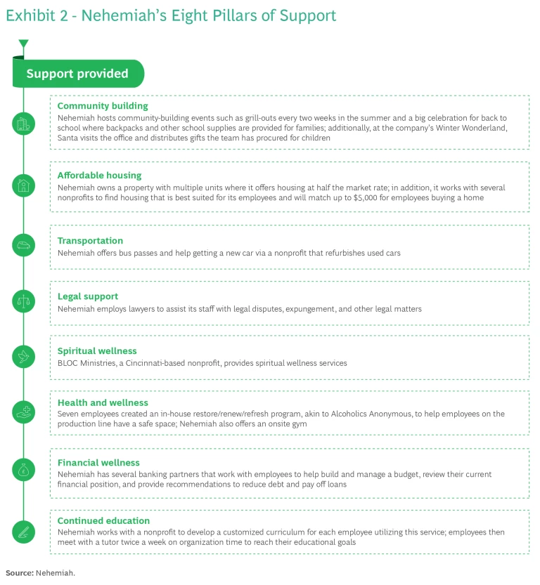 To scale this solution, Nehemiah’s CEO calculated the cost of the employee turnover and invested a portion of that cost into funding additional social workers and other services. As its fair-chance employee count grew, Nehemiah increased the number of days social workers were available until they had a full team. As a result, turnover shrunk to 15%, significantly lower than that of competitors (whose turnover could exceed 50%). The experience enabled holistic support for fair-chance hires and contributed to a web of essential and supplementary wraparound services that have turned into Nehemiah’s eight pillars of support.