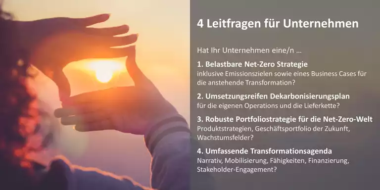 - Transformation als riesige Chance für Deutschland, durch die Modernisierung der Volkswirtschaft, die Reduzierung der Energieimportabhängigkeit sowie die Erschließung neuer globaler Märkte für Klimaschutztechnologien die Grundlage für unseren zukünftigen Wohlstand zu schaffen