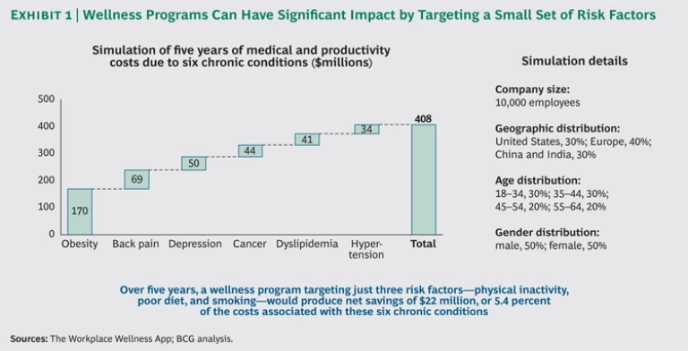 BCG and Healthways also developed a simulation model that—based on a company’s demographics and the risk factors the company chooses to target—estimates the savings that a wellness program could generate. For example, the model showed that a company with 10,000 employees could reduce the costs associated with six chronic diseases by 5.4 percent over five years by targeting physical inactivity, poor diet, and smoking. (See Exhibit 1.)