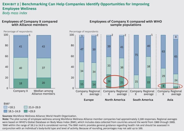 Although the Alliance is relatively new, the metrics database already includes about 135,000 responses from 11 companies, giving participants enough information to pinpoint opportunities for action. In gathering and assessing data on employees’ body mass index (BMI), one of the participating companies found significant variations across different regions. (See Exhibit 2.) With these results and bearing in mind relevant nuances in local customs and health-care practices, the company was able to explore why some regions were better able to mitigate certain risk factors, and it could then apply these lessons to regions where the risk factors remained high.
