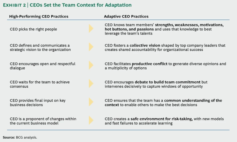 Recent neuroscientific research shows that learning new things activates the most energy-intensive part of the brain. Adaptive leaders understand this intuitively and are therefore dedicated to identifying and employing the most effective approaches to driving organizational learning and change. They enable people to solve problems on their own as well, and reward accomplishment with autonomy, giving individuals a way to engage in additional independent problem-solving in the future. Furthermore, the more discerning CEOs excel at practices that create a team context for successful adaptation. (See Exhibit 2 below.)