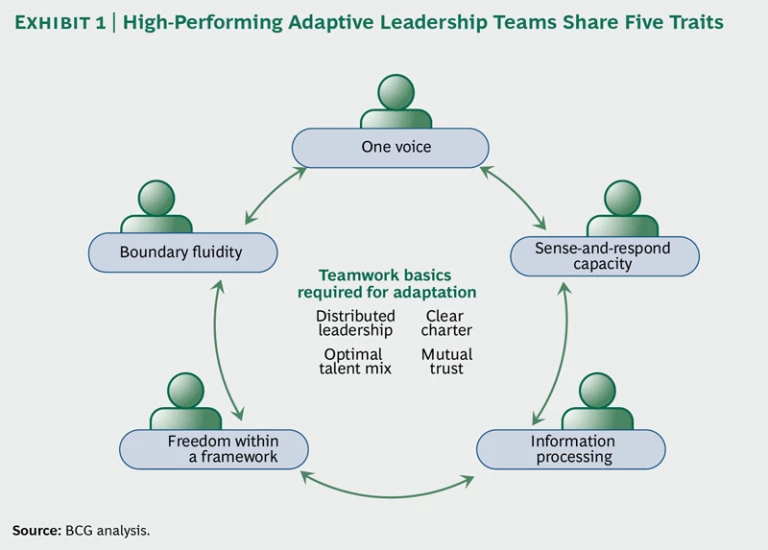 The results disproved some common fallacies about teamwork and adaptiveness. For instance, observers often claim that as companies get bigger, they get less adaptive. We found that not to be true. Adaptability also often implies a lack of discipline. We found just the opposite: adaptive teams have highly disciplined mechanisms and processes that free them up to be more adaptive. Further, in today’s business context, adaptability can no longer be thought of as an ad hoc skill or last-gasp maneuver that is brought to bear only in times of desperation. In fact, when asked if there were conditions under which leadership teams should not cultivate adaptive capacity, the overwhelming majority of leaders struggled to find examples—especially given the current marketplace challenges faced by even the most stable business models.