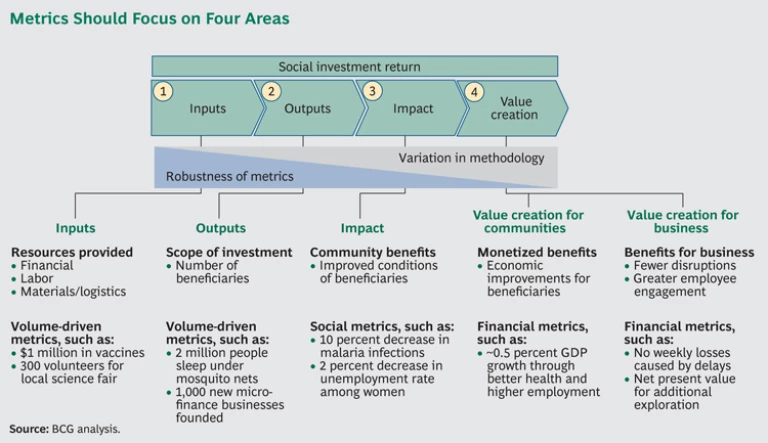 Defining Metrics of Success. Although some outcomes will be intangible or difficult to evaluate, clear metrics can help quantify the impact of outreach initiatives. The most effective metrics focus on four areas: inputs, outputs, impact, and value creation. (See the exhibit.) Output metrics—such as how many more local children got access to education, or how many people were vaccinated against a disease—are highly comparable across time, sites, and companies. Impact for the business could be measured by how much worker absentee rates were reduced, or how much faster positions were filled with qualified workers. At the back end, a monitoring and evaluation process can help make the activities more effective and efficient by prioritizing social and business returns. Clearly identifying the impact on the community and the business also shows the value of the efforts to the company and its shareholders—and the need for continued investment.