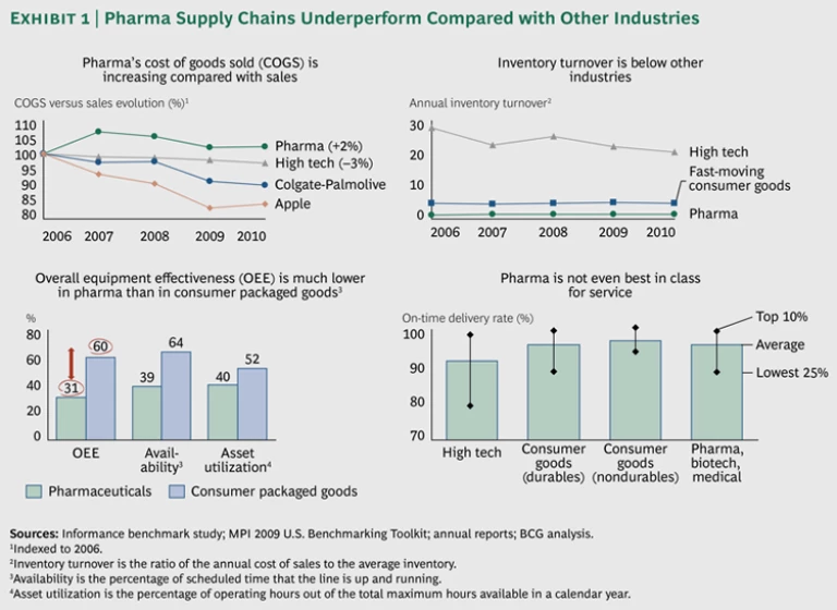 To succeed, the pharma supply chain must be lean, low cost, and flexible—without sacrificing product quality and service. Unfortunately, the typical pharma supply chain—with its fundamental steps of purchasing, producing active pharmaceutical ingredients, manufacturing, and distribution—is subpar relative to that of other industries. It shows weaknesses in critical areas of performance, including cost of goods sold, overall equipment effectiveness, inventory turnover, and even service. (See Exhibit 1.) This is not surprising, because pharma supply chains were designed to focus on maximizing service levels in a stable business environment, not to respond quickly to demand variability, which is a growing issue. In the past, demand was relatively predictable after the launch of a product and relatively stable in the developed markets that generated the bulk of sales. Supply disruptions were prevented by investing heavily in inventory and production capacity—a costly approach but one that was justified by high product margins. With these preexisting constraints and inefficiencies, pharma supply chains are forced to be reactive at all times, and they can barely meet today’s business requirements without extraordinary effort. Companies that continue on this path will lose their ability to compete and are putting their future viability at risk.