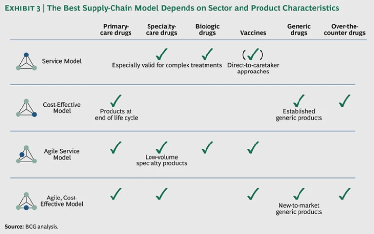 The Agile Service Model. Availability and fast response times are critical when new products are launching, customer demand is volatile, and sales volumes fluctuate due to factors such as competitors moving in and out of a market and the introduction of competing drugs in a therapeutic area. The goal of the agility model is to create a flexible, highly responsive manufacturing and distribution network by rethinking current processes, production strategies, and network design; outsourcing noncore activities; and using partnerships, contract manufacturing, and logistics providers to increase flexibility. Strong end-to-end supply-and-demand planning and information flows are also critical in order to optimize inventory levels. Segments that will benefit the most from this model are those in which product enhancements have resulted in a proliferation of stock-keeping units, new priority markets have highly uncertain forecasts, and constraints of a technical nature such as cold chain or shelf life require supply chains that are more flexible and responsive. A good example of a segment well suited to this model is a patented product with strong growth prospects in a large emerging market such as Brazil.