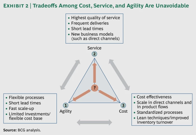 Maximizing all three dimensions at the same time is impossible, of course, and tradeoffs are unavoidable. High service levels often come at a higher cost, for instance. (See Exhibit 2.) With a deeper understanding of business requirements, business and supply chain leaders can develop the insights needed to decide which tradeoffs should be made for which products; to align the often-diverging priorities of R&D, operations, and marketing; and to deliver on these important priorities.