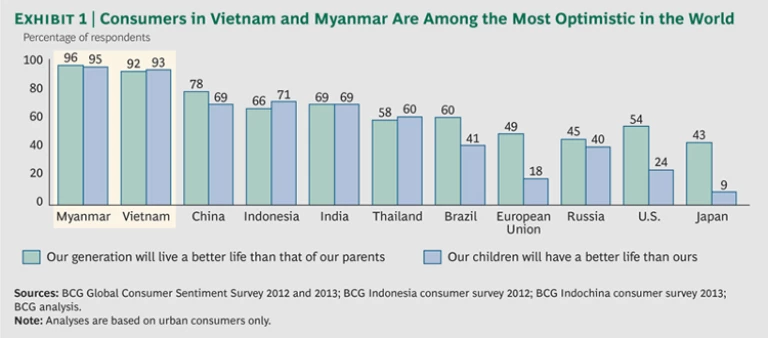 • Consumers in Myanmar and Vietnam are the most optimistic in Asia, with 93 percent and 95 percent, respectively, saying that their children will have a better life than they do.