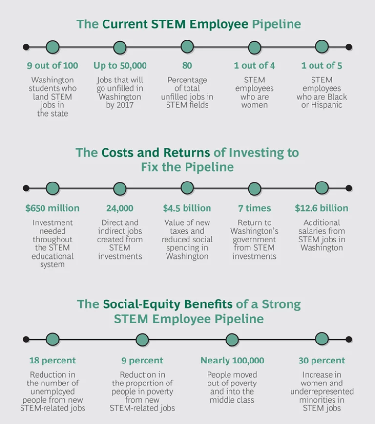 Washington State is home to numerous world-class technology, aerospace, clean-energy, and biomedical companies. Nevertheless, the pipeline for employees in science, technology, engineering, and math—collectively known as STEM—is broken. The state currently cannot meet the demand for STEM jobs with local talent and must instead import those workers from out of state or abroad. As a result, Washington is missing out on creating critical middle-class jobs for all its citizens, especially women, underrepresented minorities, and those with low incomes. (See Opportunity for All: Investing in Washington State’s STEM Education Pipeline, BCG Focus, December 2014.)Let’s take a look at the current state of the STEM employee pipeline, the costs and returns of investing to fix it, and the social-equity benefits of creating more STEM jobs in Washington.