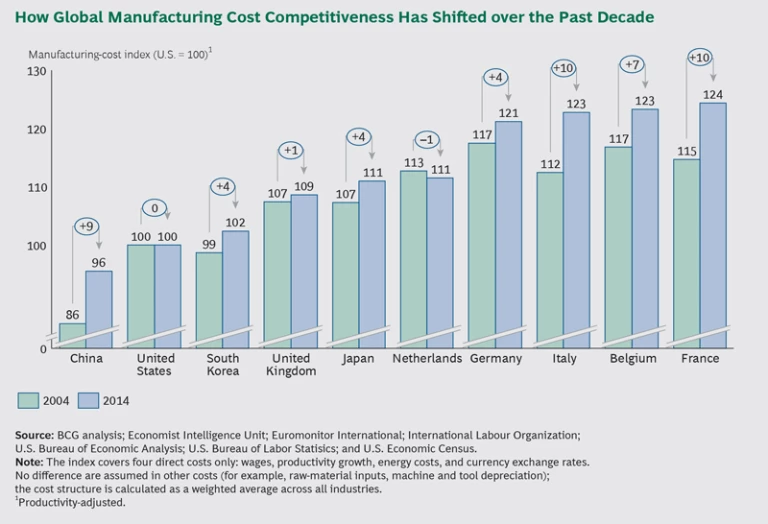 Some of the shifts in cost competitiveness have been both surprising and dramatic. China’s direct cost advantage has narrowed considerably relative to most other major goods exporters, and its advantage over the U.S. has shrunk from 14 percentage points to only 4 over the past decade. The U.S. now is the second-cheapest manufacturing location in the top ten. The UK and the Netherlands have essentially held their ground since 2004 and are now the lowest-cost manufacturing nations of western Europe. France, Italy, and Belgium, which already had relatively high direct costs in 2004, have lost even more ground since then.