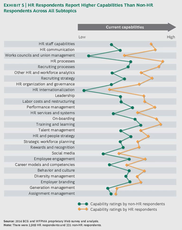 Such results reinforce a common stereotype of HR: that the function is better at working with “softer” aspects of human capital, such as training and development, and is less skilled at applying the economic logic required for higher-level areas, such as workforce productivity, planning, and forecasting.
