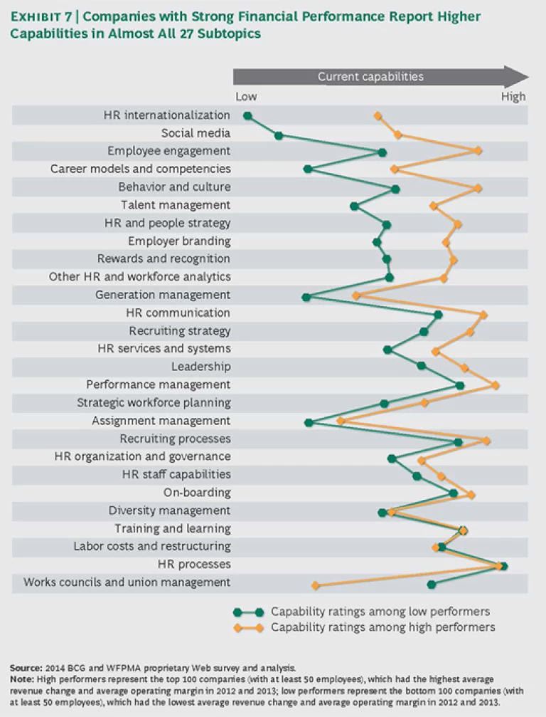 - HR capabilities correlate with economic performance. Companies that have strong capabilities in HR topics—such as talent and leadership; engagement, behavior, and culture management; and HR strategy, planning, and analytics—show significantly better financial performance than companies that are weaker in those areas.
