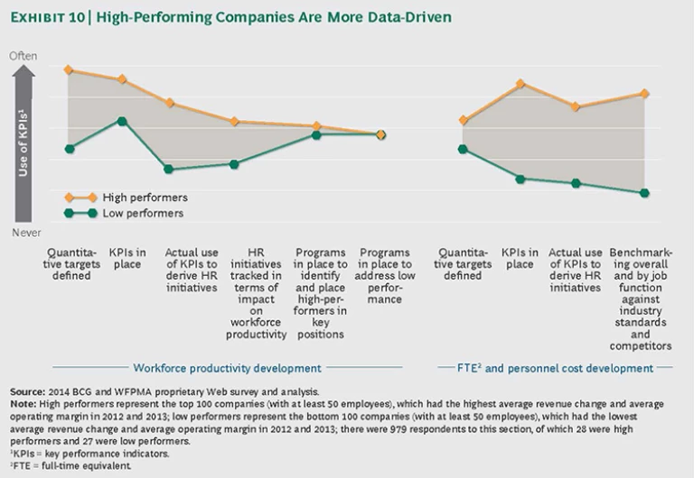 The use of HR KPIs and steering tools is yet another point of differentiation between high performers and low performers. (See Exhibit 10.)