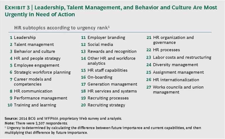 - Globally, the leadership and talent management topics are the ones in the most urgent need of action. Across industries and regions, most respondents identified leadership, talent management, behavior and culture, HR and people strategy, employee engagement, and strategic workforce planning as the topics that are most urgently in need of action by their organization.