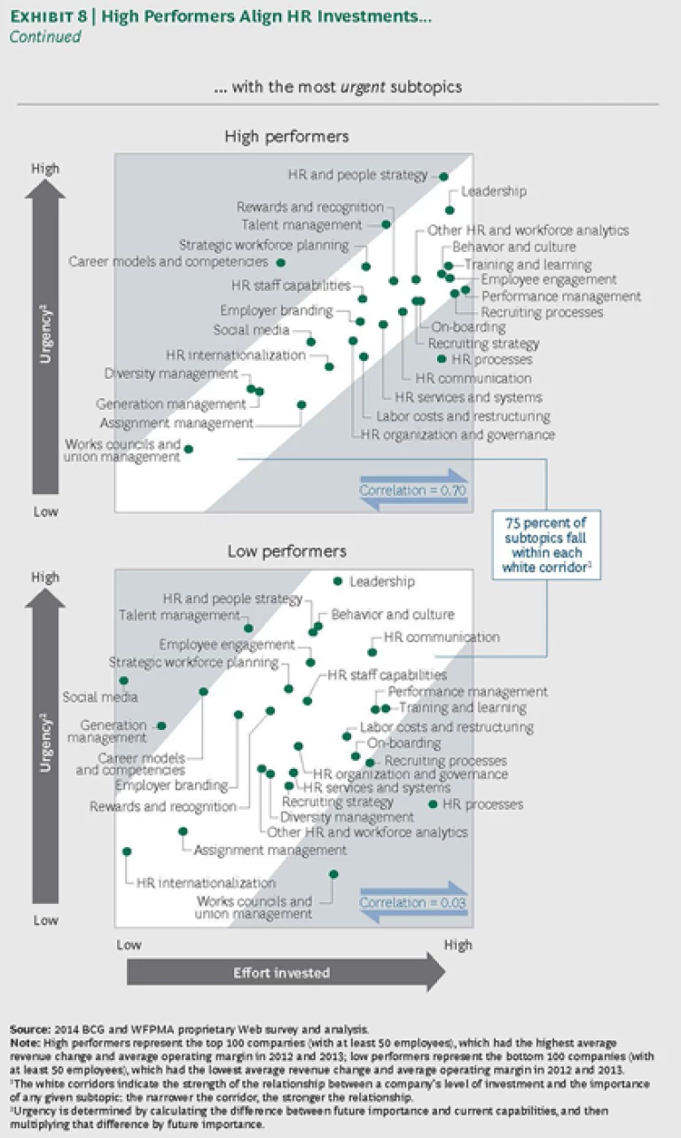 The alignment issue also arises when looking at the urgency of specific HR subtopics. Again, top performers are more strategic in the way they invest their efforts, focusing on the subtopics that they deem to be most urgently in need of action.