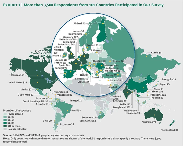 More than 3,500 respondents from 101 countries participated in our online survey in 2014. (See Exhibit 1.) We also conducted 64 in-depth interviews with HR and non-HR executives at leading companies in a variety of regions. (For more, see the Appendix.)