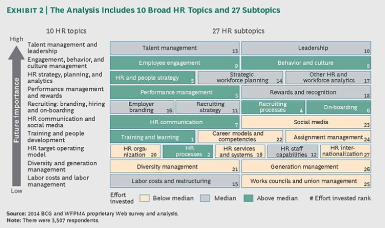 Exhibit 2 shows the ten HR topics ranked by respondents’ assessment of future importance. The 27 subtopics are color-coded according to the levels of effort invested. Interestingly, while levels of effort broadly link to future importance, there are notable exceptions. For example, leadership, talent management, and strategic workforce planning are among the highest priorities, yet they received only average levels of investment. Clearly, companies must be more consistent in their investment decisions.