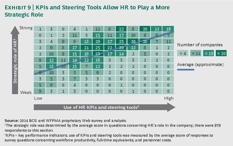 HR functions that use people-related KPIs and steering tools (such as simulations and forecasts) to measure areas such as workforce productivity and personnel costs, and then analyze and communicate the results throughout the organization, have a greater strategic role in the organization.