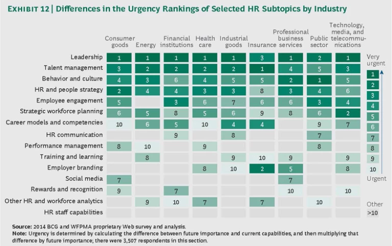 An industry breakdown shows similar differences among the relative levels of urgency of specific subtopics. While leadership, talent management, and behavior and culture were ranked as the three most urgent across most industries, we uncovered several key insights. (See Exhibit 12.)