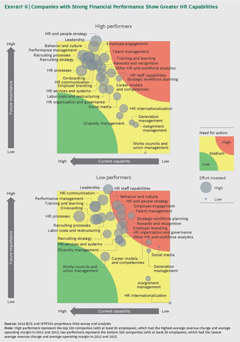 High- and low-performing companies also have different priorities in terms of future importance. HR internationalization, HR and workforce analytics, recruiting strategy, HR and people strategy, and career models and competencies are significantly more important in high performers than in low performers.