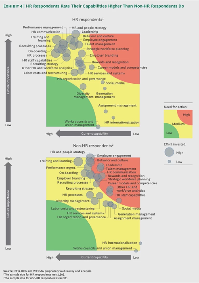 - HR needs to listen more to internal clients. Non-HR respondents reported a strong need for action with regard to approximately 40 percent of HR topics, particularly in core HR capabilities, such as staff capabilities and communication.