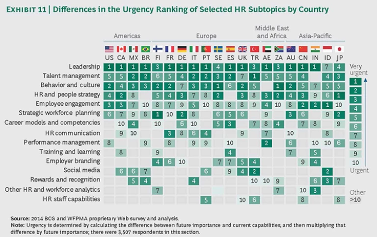 For example, behavior and culture, as well as employee engagement, were all ranked as more urgent in the U.S. than they were in most other regions. In that market, growth is slowly returning and unemployment is easing. As a result, the competition for labor—particularly in skilled positions—is becoming tougher. Increasingly, some companies are finding that they have to manage their employees on a long-term basis.