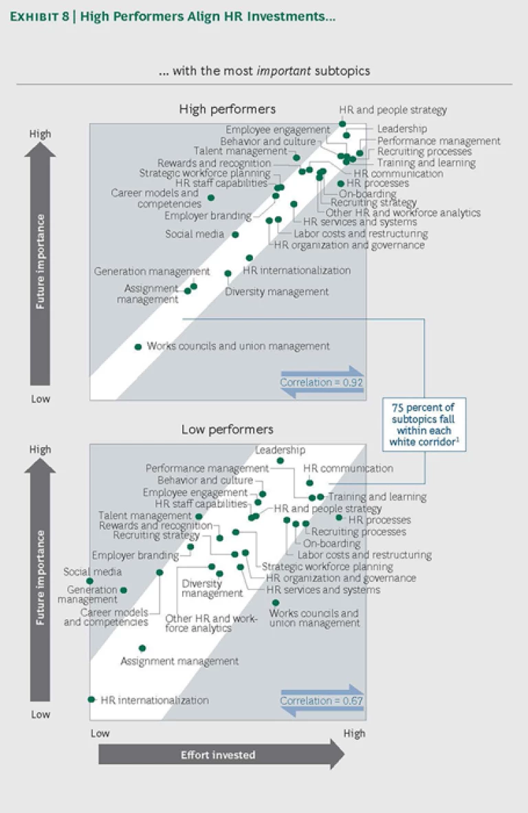 One possible explanation for the superior HR achievement of high performers is their strategic allocation of investment. (See Exhibit 8.)