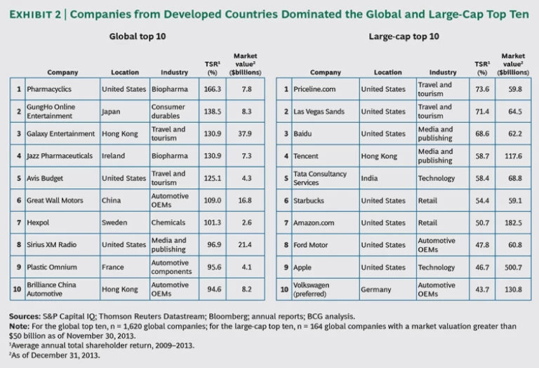 Unlike recent years, when companies from emerging markets dominated our global top ten, developed countries win the prize this year, with seven of the ten coming from the U.S., France, Japan, Ireland, and Sweden. When it comes to the world’s largest companies, six of the top ten are located in the U.S.—and a seventh, the Chinese Internet- search provider Baidu, is listed on a U.S. stock market. Leading U.S. large-cap value creators include Priceline.com and Las Vegas Sands, at number one and number two, respectively; retailers Starbucks and Amazon.com at numbers six and seven, auto company Ford Motor at number eight, and Apple (by far, the company with the biggest market valuation on our list) at number nine. (See the right-hand list in Exhibit 2.)
