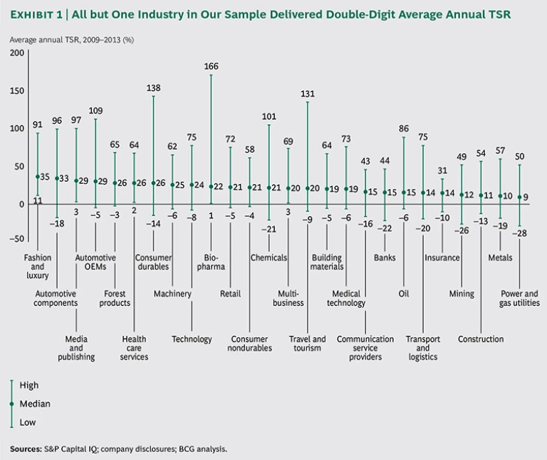 What a difference five years make. In 2009, global equity markets were coming off the biggest decline in valuations since the Great Depression. Five years later, the companies in BCG’s Value Creators database delivered double-digit average annual total shareholder return (TSR) for the five-year period from 2009 through 2013.