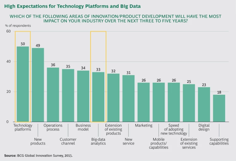 In this year’s survey of the state of innovation at companies worldwide, advances in technology platforms ranked as the most important factor driving innovation, and big-data analytics was not far behind. (See the exhibit.) This isn’t just lip service: more than half of those who see tech platforms and big data as having a big impact are actively pursuing them as avenues of innovation.