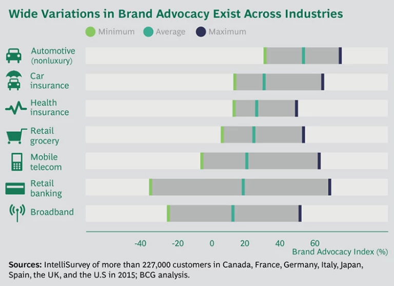 In all industries, however, we have found a large gap between the highest- and lowest-performing companies. The results show that advocacy is relevant in every industry and can be improved. (See the exhibit “Wide Variations in Brand Advocacy Exist Across Industries.”)
