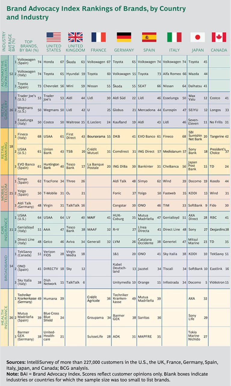 To learn about where companies stand, we surveyed more than 227,000 consumers in Canada, France, Germany, Italy, Japan, Spain, the UK, and the U.S. (See the exhibit “Brand Advocacy Index Rankings of Brands, by Country and Industry.”)