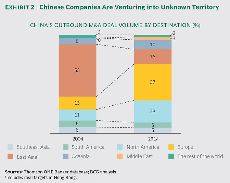 During the past few years, Europe and North America have surpassed Asia as the most sought-after targets for outbound M&A, accounting for roughly 60 percent of outbound M&A deals by Chinese companies in 2014. (See Exhibit 2.) By contrast, the number of deals targeting traditional destinations, such as East Asia, has plummeted. Given the wide disparities in language, management style, and corporate culture between European and U.S. companies versus Chinese companies, the westernizing of outbound M&A destinations presents new challenges for Chinese buyers.