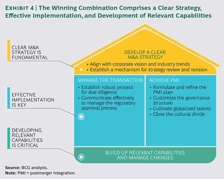 How can Chinese companies overcome the obstacles they so often encounter when pursuing outbound M&A? We believe that successful outbound deal making rests on three pillars: a clear M&A strategy, effective implementation, and building relevant capabilities. (See Exhibit 4.) Thus, we offer the following recommendations to senior executives of Chinese companies aiming to step up onto the global stage.