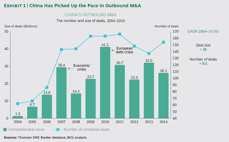 At first glance, Chinese companies would appear to be enjoying a golden age of deal making: the outbound M&A market flourished from 2004 through 2014, with deal value growing at a compound annual rate of as much as 35 percent, and deal volume expanding at a compound annual rate of 9.5 percent. In 2014 alone, Chinese companies made 154 outbound M&A deals, with a total deal value of $26.1 billion. (See Exhibit 1.)
