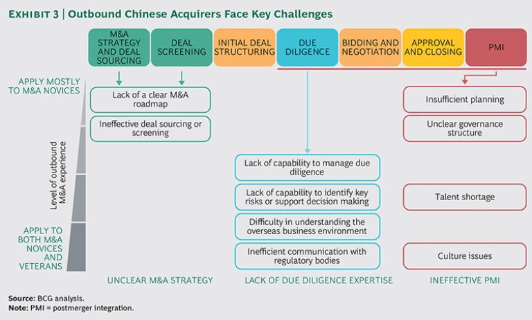 We have identified the greatest of those challenges, drawing on our analysis of outbound M&A deals during the past decade and our observations of evolving trends in the field. As we suggested earlier, these challenges center on M&A strategy, due diligence, and PMI—the fundamentals of effective deal management. (See Exhibit 3.)